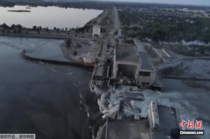 資料圖:當(dāng)?shù)貢r間6月6日,由烏克蘭總統(tǒng)辦公室提供的卡霍夫卡水電站大壩受損視頻截圖。