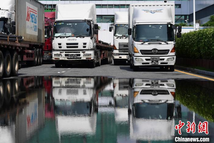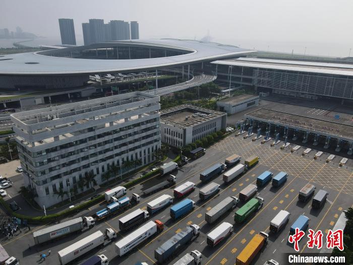 港珠澳大橋已成為粵港澳大灣區(qū)重要的人員往來和貿(mào)易通道,港珠澳大橋通關(guān)口岸貨車通道排隊(duì)等候的貨車?!√镉觋?攝