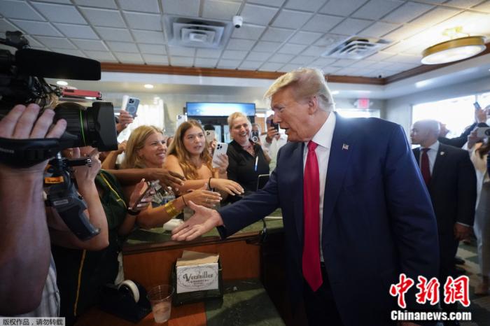 法庭聽證會(huì)結(jié)束后,特朗普在邁阿密一家著名餐廳停留。他被數(shù)十名支持者包圍,與他們握手并合影留念。