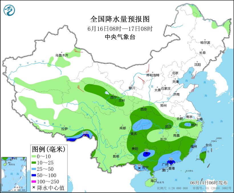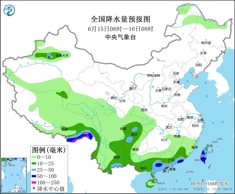 6月15日08時至16日08時,新疆沿天山地區(qū)、西藏東南部、四川南部和東部、重慶西南部、云南中東部、廣西中南部、廣東中南部、福建南部、臺灣島等地部分地區(qū)有中到大雨,其中,西藏東南部、廣東西部和南部沿海、臺灣島等地部分地區(qū)有暴雨或大暴雨(100~120毫米)。內(nèi)蒙古中部、遼東半島、寧夏北部等地部分地區(qū)有4~6級風(見圖3)。