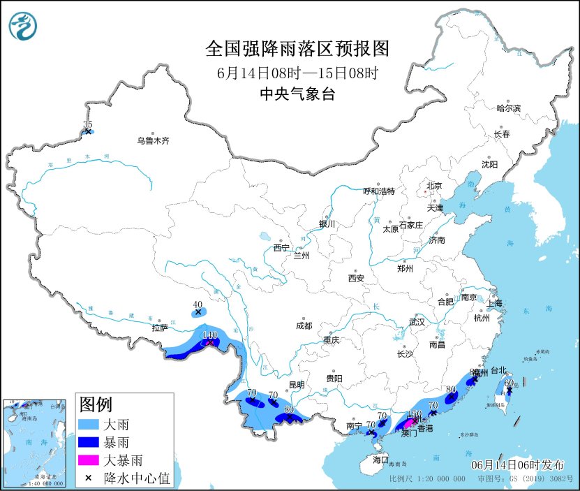 其中,6月14日08時至15日08時,廣東中南部、廣西東南部、福建東南部、臺灣島中北部以及云南南部和西部、西藏東南部等地部分地區(qū)有大到暴雨,其中,廣東西南部沿海、西藏東南部等地局地有大暴雨(100~150毫米);上述部分地區(qū)伴有短時強降水(最大小時降雨量30~60毫米,局地可超過80毫米),局地有雷暴大風等強對流天氣。中央氣象臺6月14日06時繼續(xù)發(fā)布暴雨藍色預警(見圖1)。