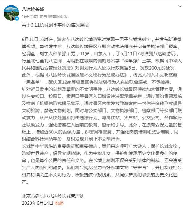 經調查,刻字人種某強(男,41歲,山東人),于6月11日7時許到八達嶺游玩,行至北七至北八之間,用鑰匙在城墻內側刻劃名字“種某強”三字。根據《中華人民共和國治安管理處罰法》對刻劃行為人處以行政拘留5日、罰款200元的處罰。此外,根據《八達嶺長城景區(qū)破壞文物行為懲戒辦法》,將此人列入不文明旅游“黑名單”,延慶區(qū)12家等級景區(qū)將對刻劃行為人實施聯(lián)合懲戒、不予接待。