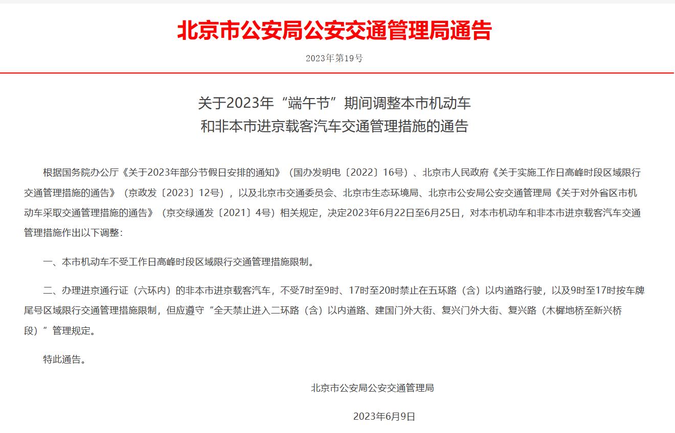 中新網(wǎng)6月14日電 據(jù)北京市公安局公安交通管理局網(wǎng)站消息,北京市公安局公安交通管理局近日發(fā)布通告稱,根據(jù)國務院辦公廳《關于2023年部分節(jié)假日安排的通知》(國辦發(fā)明電〔2022〕16號)、北京市人民政府《關于實施工作日高峰時段區(qū)域限行交通管理措施的通告》(京政發(fā)〔2023〕12號),以及北京市交通委員會、北京市生態(tài)環(huán)境局、北京市公安局公安交通管理局《關于對外省區(qū)市機動車采取交通管理措施的通告》(京交綠通發(fā)〔2021〕4號)相關規(guī)定,決定2023年6月22日至6月25日,對本市機動車和非本市進京載客汽車交通管理措施作出以下調(diào)整: