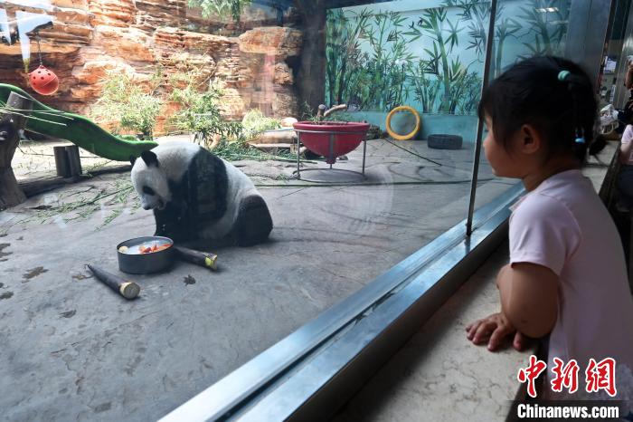 圖為15日石家莊市動物園里,大熊貓坐在放有冰塊的房間里,吹著空調(diào)享用美食?!〉杂鸺?攝