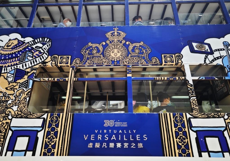 這是5月18日在香港拍攝的“虛擬凡爾賽宮之旅”展車體廣告。新華社記者 王申 攝