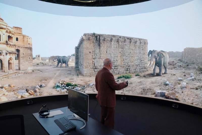 走進(jìn)香港浸會(huì)大學(xué)視覺化研究中心,約兩人高的360度全景屏幕創(chuàng)造了一個(gè)沉浸式的影院空間。這一由400個(gè)LED顯示屏組裝而成的設(shè)備承載著邵志飛對(duì)于“未來影院”的設(shè)想。