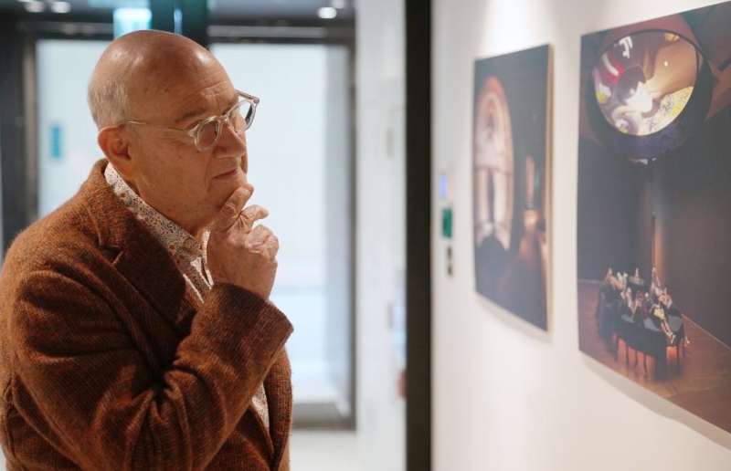 在香港浸會(huì)大學(xué)視覺化研究中心,香港浸會(huì)大學(xué)視覺藝術(shù)院講座教授、藝術(shù)家邵志飛在自己的作品前駐足(5月11日攝)。新華社記者 王申 攝