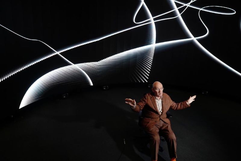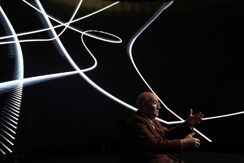 在香港浸會(huì)大學(xué)視覺化研究中心,香港浸會(huì)大學(xué)視覺藝術(shù)院講座教授、藝術(shù)家邵志飛在配備有傳感器和生物識(shí)別技術(shù)的全景影院中展示作品(5月11日攝)。新華社記者 王申 攝