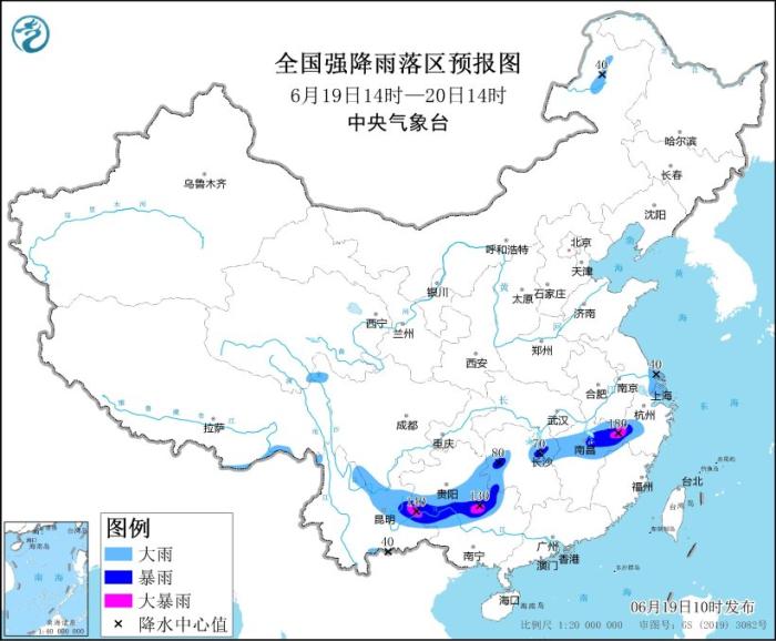中新網(wǎng)6月19日電 據(jù)中央氣象臺網(wǎng)站消息,中央氣象臺6月19日10時繼續(xù)發(fā)布暴雨藍(lán)色預(yù)警:預(yù)計,6月19日14時至20日14時,江蘇東部、上海、浙江西部、江西北部、湖南西部和北部、貴州南部和東部、廣西西北部、云南東部、四川南部以及內(nèi)蒙古東北部等地的部分地區(qū)有大到暴雨,其中,云南東部、貴州西南部、廣西西北部、江西東北部、浙江西部等地局地有大暴雨(100~180毫米)。上述部分地區(qū)伴有短時強降水(最大小時降雨量20~50毫米,局地可超過60毫米),局地有雷暴大風(fēng)等強對流天氣。