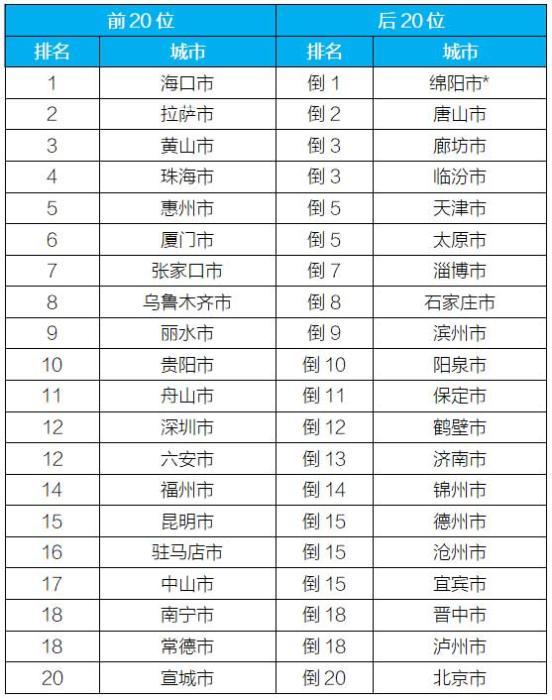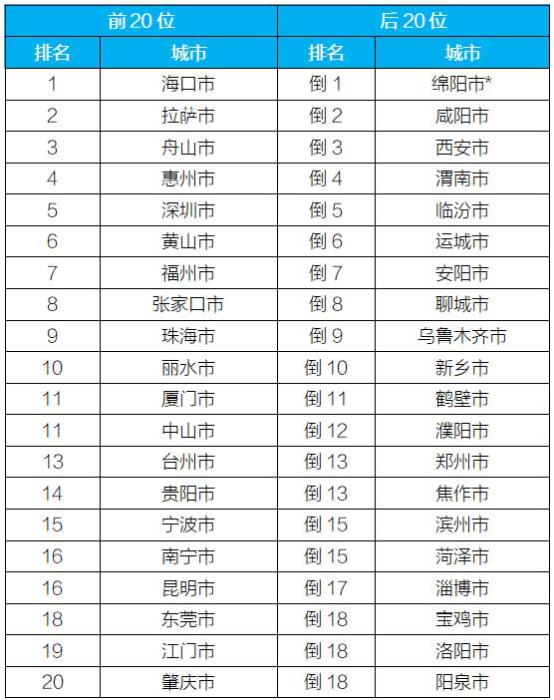 空氣質(zhì)量排名前20位和后20位城市名單