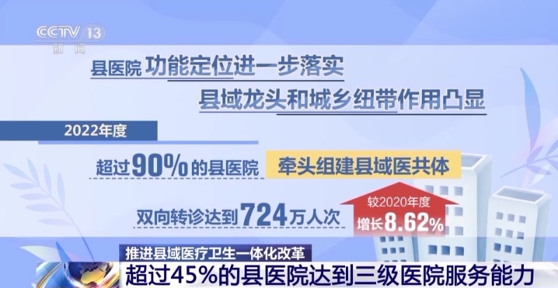 國(guó)家衛(wèi)生健康委日前通報(bào)的《2021-2022年度縣醫(yī)院醫(yī)療服務(wù)能力評(píng)估情況》顯示,截至2022年底,超過(guò)87%的縣醫(yī)院達(dá)到了二級(jí)醫(yī)院服務(wù)能力,超過(guò)45%的縣醫(yī)院達(dá)到了三級(jí)醫(yī)院服務(wù)能力。