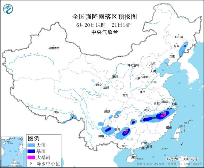 中新網(wǎng)6月20日電 據(jù)中央氣象臺(tái)網(wǎng)站消息,中央氣象臺(tái)6月20日10時(shí)繼續(xù)發(fā)布暴雨藍(lán)色預(yù)警:預(yù)計(jì),6月20日14時(shí)至21日14時(shí),四川南部、重慶西南部、貴州南部、云南東部、廣西西北部、湖南中部、江西中北部、浙江中西部、福建西北部以及吉林東部、西藏東南部等地部分地區(qū)有大到暴雨,其中,江西東北部、浙江西南部、廣西西北部等地局地有大暴雨(100~150毫米)。上述部分地區(qū)伴有短時(shí)強(qiáng)降水(最大小時(shí)降雨量20~50毫米,局地可超過(guò)60毫米),局地有雷暴大風(fēng)等強(qiáng)對(duì)流天氣。