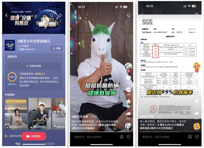 慕思發(fā)布的#慕思618世界除螨日#品牌活動得到了全網(wǎng)慕思新老用戶的熱烈響應(yīng),目前已近萬名抖音用戶上傳了自己在家中進行除螨、吸塵的視頻,話題累計互動量破億,在抖音帶動了一場家庭深度大掃除運動,掀起全網(wǎng)“除螨”熱。