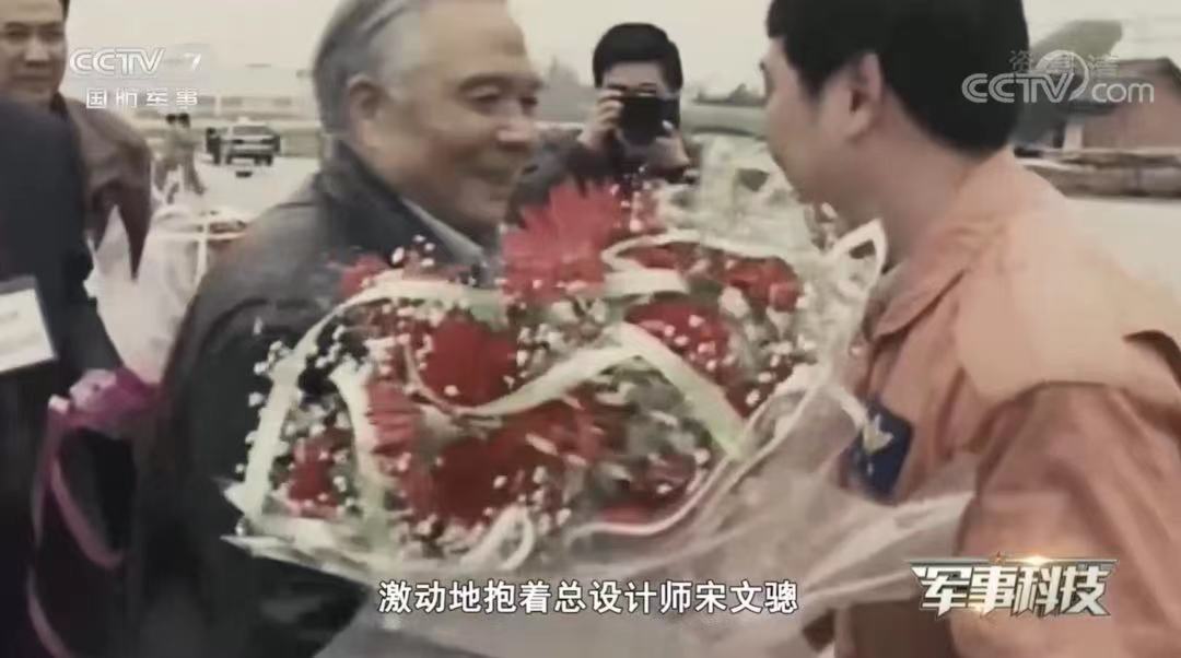 殲-10總設(shè)計(jì)師宋文驄手舉鮮花與試飛員雷強(qiáng)流淚擁抱。