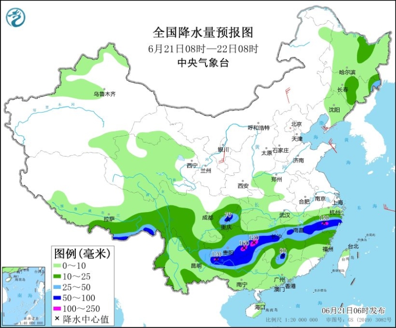 6月21日08時至22日08時,6月21日08時至22日08時,浙江中南部、江西中部、福建西北部、湖南中部、貴州中南部、廣西西北部、重慶西南部、云南東部、廣東北部以及西藏東南部、吉林東北部等地部分地區(qū)有大到暴雨,其中,湖南西部、浙江西南部、貴州南部等地局地有大暴雨(100~160毫米)。內(nèi)蒙古中部、遼東半島、寧夏等地部分地區(qū)有4~5級風(fēng)。