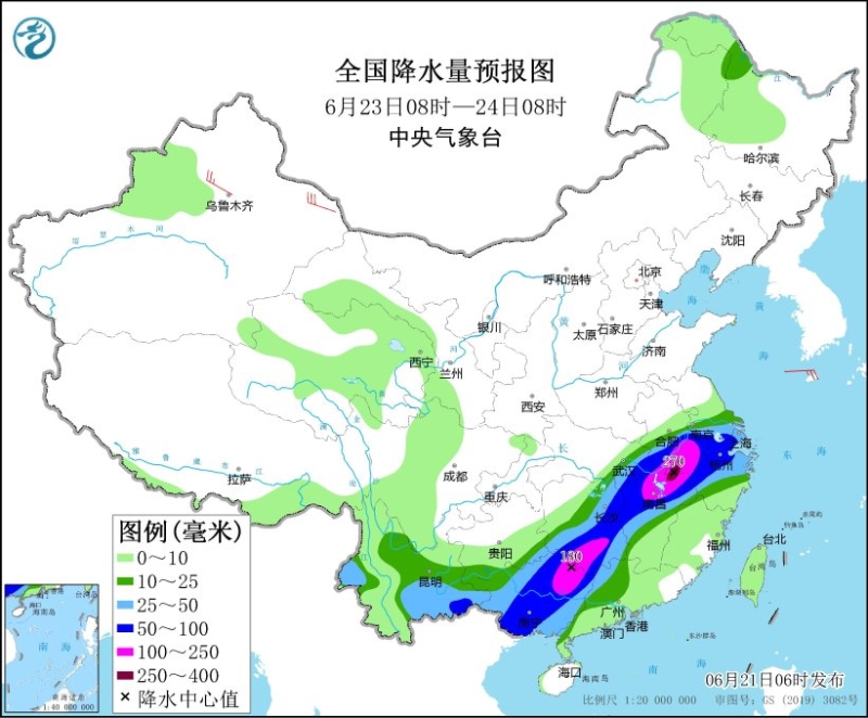 全國降水量預(yù)報圖(6月21日08時-22日08時)