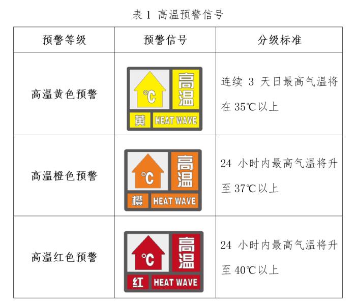 (1)高溫預(yù)警信號。《氣象災(zāi)害預(yù)警信號及防御指南》規(guī)定高溫預(yù)警信號分三級(詳見表1)。