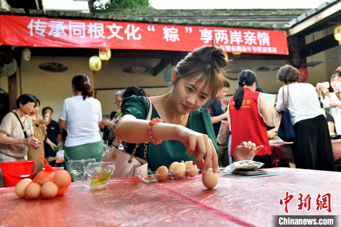 6月20日,在榕臺(tái)胞端午節(jié)聯(lián)誼活動(dòng)在福州臺(tái)灣會(huì)館舉行,臺(tái)灣青年陳筱婷正在“立雞蛋”。中新社記者 呂明 攝