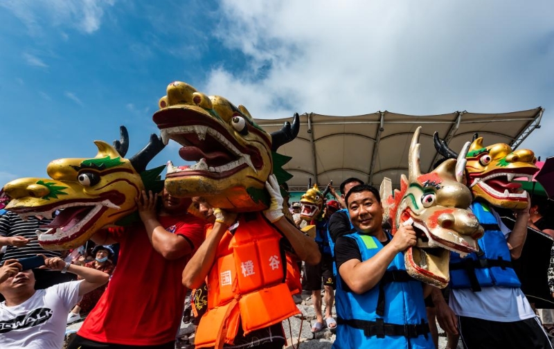 6月14日,湖北省宜昌市秭歸縣舉行龍舟賽,隊員扛著龍頭走向江邊,準(zhǔn)備參加龍舟比賽。新華社發(fā)(鄭家裕 攝)
