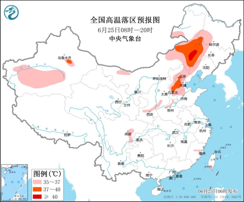 全國高溫落區(qū)預報(6月25日08時-20時)