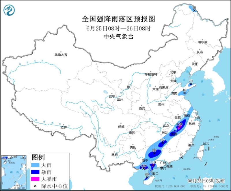 江南華南仍有大范圍強降水,26日后降水減弱。預計,6月25日08時至26日08時,廣西南部和東部、廣東西部和北部及南部沿海、湖南南部、江西中北部、安徽南部、江蘇南部、海南島西北部、山東半島南部和東部等地部分地區(qū)有大到暴雨,其中,廣西東南部沿海、廣東西南部、江西北部等地部分地區(qū)有大暴雨(100~140毫米)。上述部分地區(qū)伴有短時強降水(最大小時降雨量20~50毫米,局地可超過80毫米),局地有雷暴大風等強對流天氣。為此,中央氣象臺6月25日06時繼續(xù)發(fā)布暴雨黃色預警。