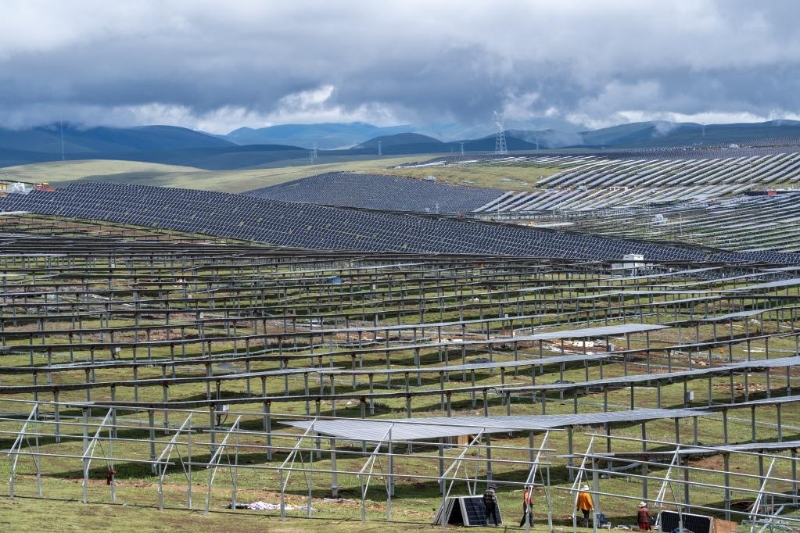 柯拉光伏電站施工面積超16平方公里,項目分布在川西高原海拔4000米至4600米的區(qū)域。由200多萬塊光伏組件、5000多臺逆變器組成,支架用鋼量近5萬噸。施工期間,建設(shè)者們克服了高寒高海拔、地形復(fù)雜、地質(zhì)多變、凍土暗冰等施工難題。創(chuàng)新“引孔+回填”工藝提升成樁質(zhì)量與施工效率,使用多層保溫措施突破高寒高海拔地區(qū)冬歇期混凝土澆筑限制,積累了高海拔地區(qū)大規(guī)模地面光伏的開發(fā)經(jīng)驗。