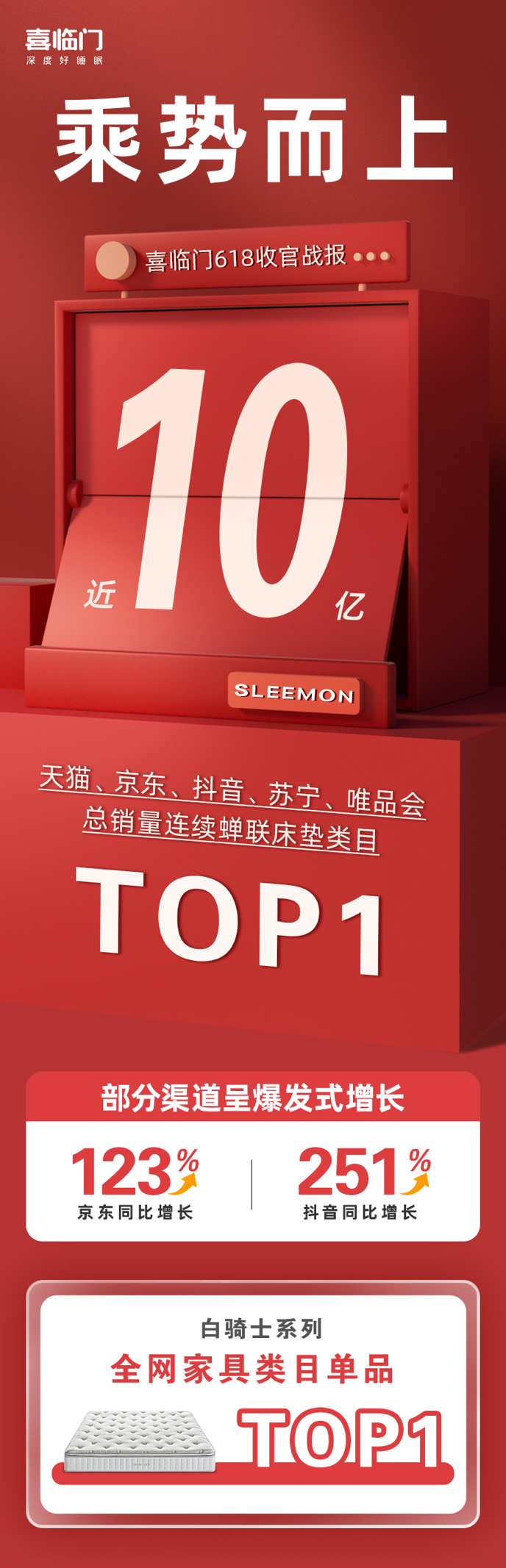 據(jù)了解,今年618活動(5月23日-6月20日)期間,喜臨門全網(wǎng)銷售額近10億元,蟬聯(lián)天貓、京東、抖音、蘇寧、唯品會等多平臺床墊類目總銷量TOP 1。其中,喜臨門在京東平臺銷售同比增長123%、抖音渠道銷售同比增長251%,均呈爆發(fā)式增長。