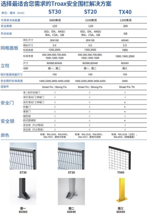 在安全方面,TX40鋼制安全圍欄系統(tǒng)可承受1200焦耳的沖擊能量,適用于場地空間比較大的生產(chǎn)區(qū)域。對于可接受此抗沖擊標準,并且有足夠安全防護空間的客戶來說,TX40將是一款高性價比的安全圍欄系統(tǒng),選擇TX40可以節(jié)約成本,讓客戶達到經(jīng)濟效益最大化。在滿足工廠需要的同時,保障安全、提高生產(chǎn)效率。如需了解更多產(chǎn)品細節(jié),請閱讀以下表格了解TX40產(chǎn)品以及其它也同樣適合您的TROAX(圖瓦斯)安全圍欄解決方案。