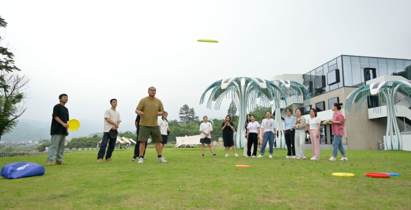 在浙江省湖州市安吉縣天荒坪鎮(zhèn)余村鄉(xiāng)村圖書館前,年輕人在草坪上玩飛盤(2023年6月5日攝)。新華社記者 才揚(yáng) 攝
