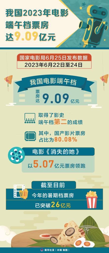 新華社北京6月25日電(記者王鵬)國家電影局25日發(fā)布數(shù)據(jù),2023年6月22日至24日,我國電影端午檔票房達9.09億元,取得了影史端午檔第二的成績。其中,國產(chǎn)影片票房占比為80.08%。