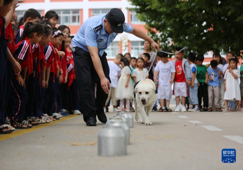6月25日,山東省沂南縣公安局在辛集鎮(zhèn)中心小學(xué)開展禁毒主題宣傳活動(dòng),給小朋友演示緝毒犬嗅毒。