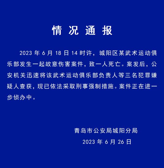 2023年6月18日14時許,城陽區(qū)某武術運動俱樂部發(fā)生一起故意傷害案件,致一人死亡。案發(fā)后,公安機關迅速將該武術運動俱樂部負責人等三名犯罪嫌疑人查獲,現已依法采取刑事強制措施。案件正在進一步偵辦中。(青島市公安局城陽分局微信公眾號)