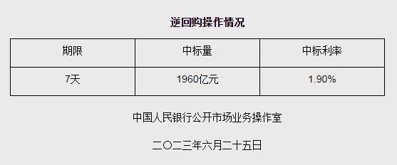 中新網(wǎng)6月25日電 據(jù)央行網(wǎng)站25日消息,為維護半年末流動性平穩(wěn),2023年6月25日人民銀行以利率招標方式開展了1960億元逆回購操作,期限為7天,中標利率為1.90%。(中新財經(jīng))