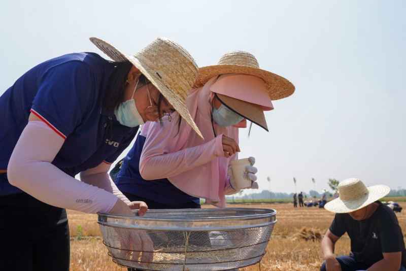 6月6日,2023年山東小麥機(jī)收減損技能大比武活動(dòng)在臨沭縣舉行,工作人員在現(xiàn)場(chǎng)測(cè)算減損率。新華社記者 朱崢 攝