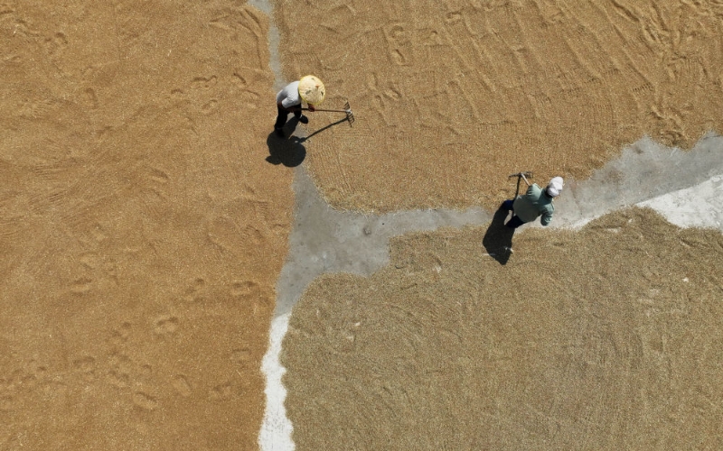 6月1日,在安徽省阜陽(yáng)市阜南縣曹集鎮(zhèn)阜蒙農(nóng)場(chǎng),農(nóng)民將收獲的小麥分揀烘干。新華社發(fā)(王彪 攝)