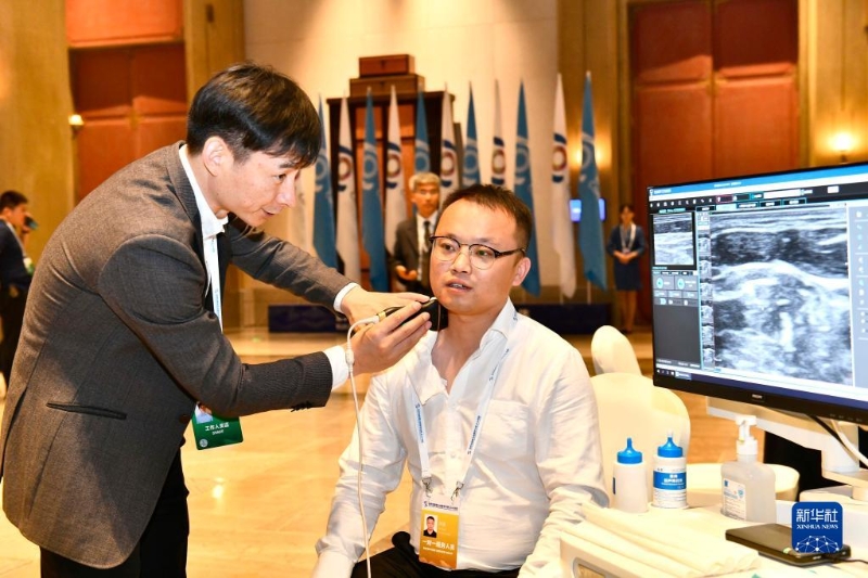 6月26日,在世界互聯(lián)網(wǎng)大會數(shù)字文明尼山對話上,與會嘉賓在體驗AI人工智能超聲篩查機(jī)器人診斷服務(wù)。