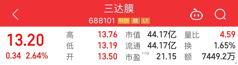 6月26日,端午假期后首個交易日,三達(dá)膜股價(jià)上漲2.64%,盤中一度漲近7%。目前,三達(dá)膜總市值44.07億元,較上一個交易日(6月21日)收盤時漲超1億。