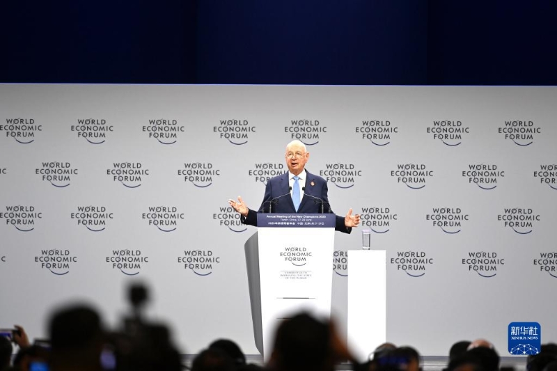 6月27日,世界經(jīng)濟(jì)論壇主席施瓦布在第十四屆夏季達(dá)沃斯論壇開(kāi)幕式上發(fā)言。