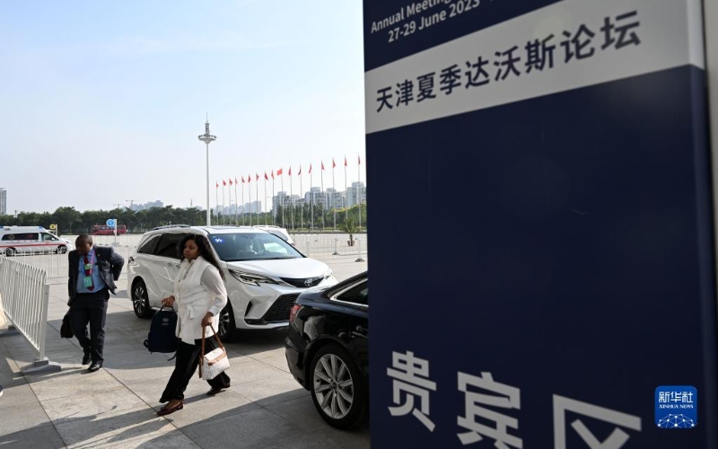 6月27日,與會(huì)者前往第十四屆夏季達(dá)沃斯論壇會(huì)場(chǎng)。