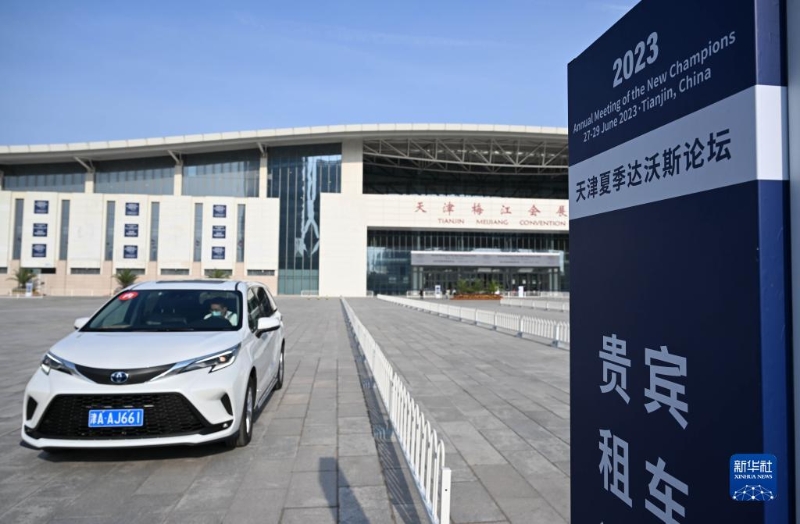 6月27日,一輛嘉賓用車(chē)停靠在第十四屆夏季達(dá)沃斯論壇會(huì)場(chǎng)前。