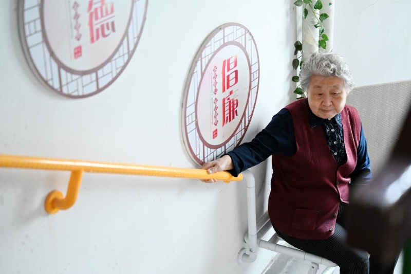 在天津市和平區(qū)文化村社區(qū),樓道內(nèi)加裝了扶手和折疊椅便于老人上下樓(2022年10月27日攝)。新華社記者李然攝