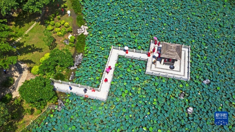 6月28日,游客在廣西南寧市獅山公園觀賞荷花(無人機(jī)照片)。