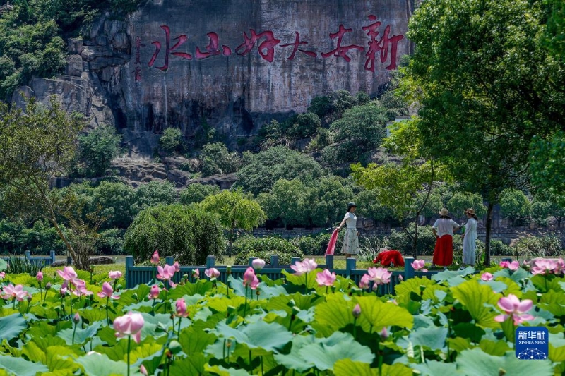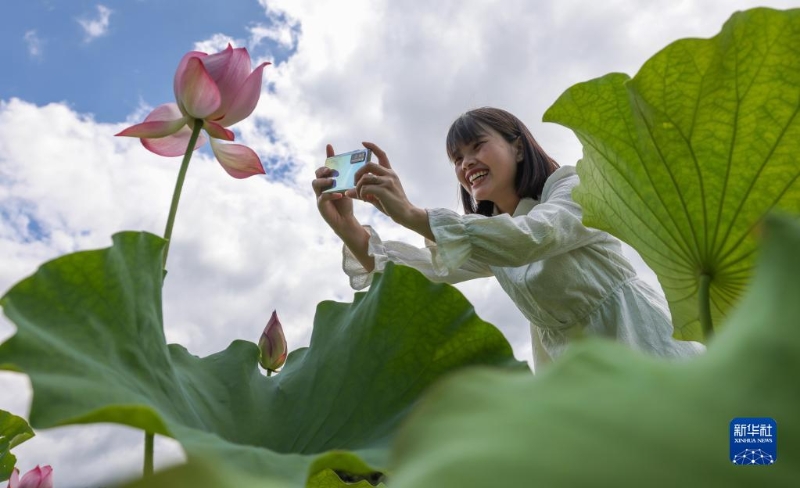 6月28日,游客在安徽省黃山市屯溪區(qū)新安江濕地公園游玩賞荷。