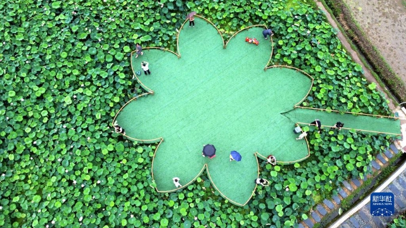 6月27日,游客在貴州省黔東南苗族侗族自治州岑鞏縣客樓鎮(zhèn)下寨村荷塘拍照。