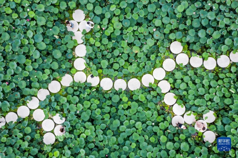 6月27日,游客在浙江省溫嶺市澤國鎮(zhèn)橋伍村荷塘中賞花(無人機(jī)照片)。