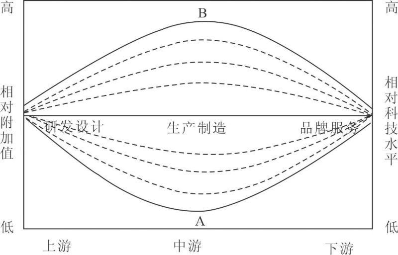 在產(chǎn)業(yè)經(jīng)濟學里有一個著名的“微笑曲線”理論,如下圖:
