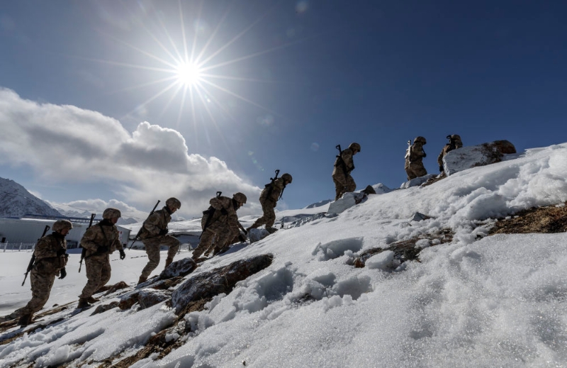 位于帕米爾高原的新疆軍區(qū)某邊防團紅其拉甫邊防連的戰(zhàn)士在巡邏(2023年4月13日攝)。新華社記者 費茂華 攝
