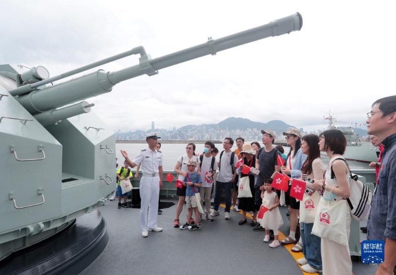 7月1日,在昂船洲軍營,解放軍官兵為參觀艦艇的香港市民講解武器裝備。新華社發(fā)(易定 攝)
