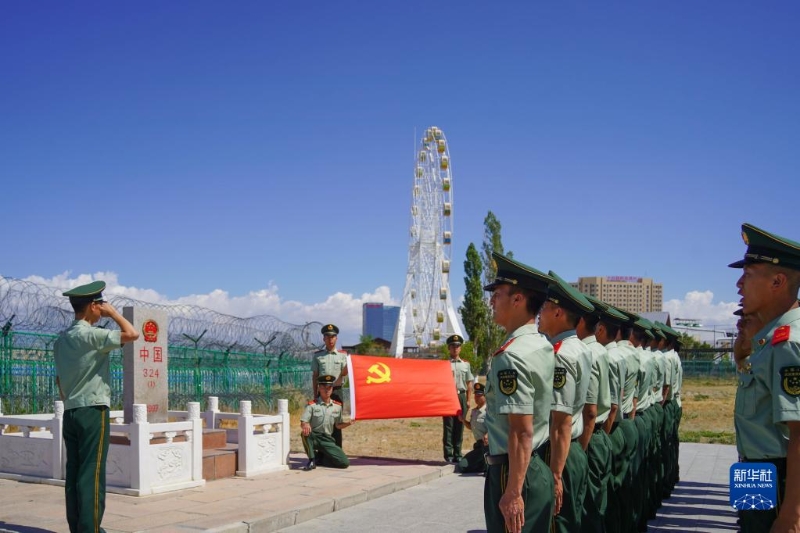 7月1日,武警兵團總隊執(zhí)勤某支隊組織黨員到新疆霍爾果斯口岸,在中哈324號界碑前重溫入黨誓詞。