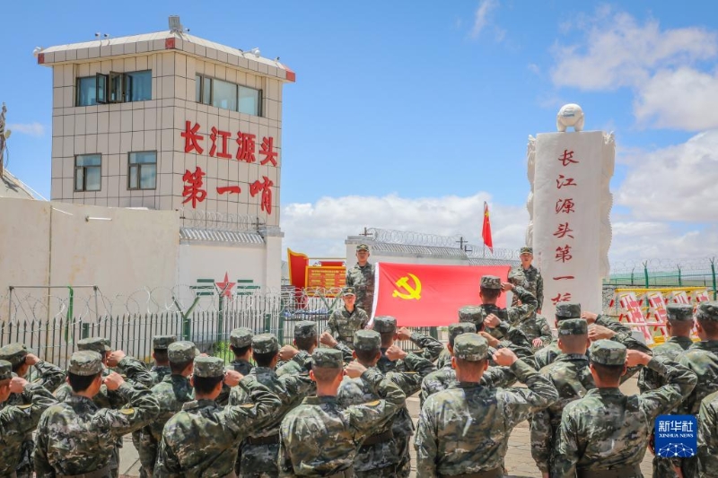 武警青海總隊海西支隊組織黨員干部在長江源特大橋哨所開展重溫入黨誓詞活動(6月30日攝)。